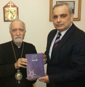 Naji Naaman presented and dedicated the first copy of his gratis volume entitled «Mi’atun wa Tastamirrul-Ibada» («One hundred years after, the genocide continues») to His Beatitude the Armenian Catholic Patriarch Nerses Bedros XIX at the Patriarchal Seat (Beirut) in presence of Monsignor Georges Yéghéyan and Marwan Naaman.